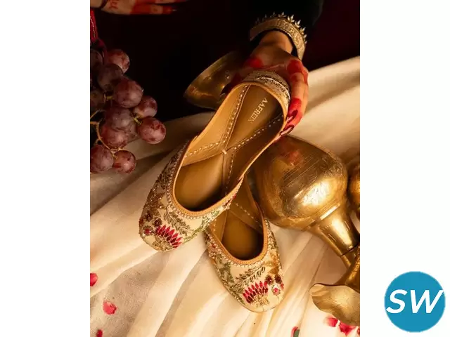Step into elegance and grace with our Aafreen Bridal Juttis – a perfect blend of tradition and modern charm. Handcrafted with intricate embroidery and premium materials, these juttis are designed to add a touch of royalty to your special day. The soft, cushioned interior ensures comfort for long hours while the exquisite detailing reflects the artistry of skilled craftsmen. Pair them with your bridal lehenga or festive attire for a stunning statement look.
