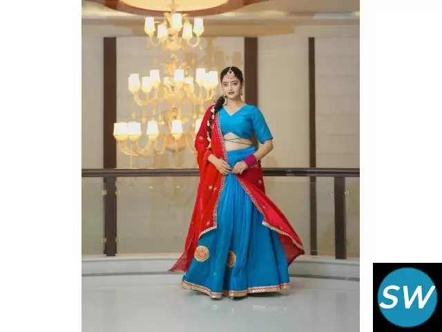 looking for a lehenga that feels effortlessly festive without being over the top — this is it. This Jaipuri gota patti lehenga is everything a wedding season wardrobe needs. Crafted on smooth jimmy choo fabric, the Moroccan blue skirt comes alive with hand-placed gota work floral motifs that shine beautifully in the light . The detailed embroidery along the hem gives it that unmistakable charm. And that pink dupatta? It's the kind of contrast that makes an outfit unforgettable. The perfect designer lehenga for wedding celebrations, sangeet night ,or any festive occasion where you want to look good without trying too hard. Comes with dupatta and unstitched blouse. Shop at Marudhaga.