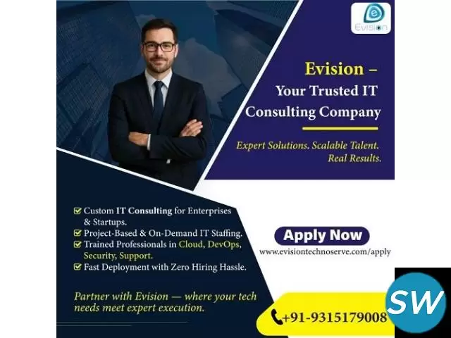 Evision Technoserve is your go-to choice for expert IT consulting, flexible staffing, and impactful tech solutions. We provide customized IT services for startups and enterprises, offering both project-based and on-demand staffing with zero hiring hassle. Our pool of certified professionals specializes in Cloud Computing, DevOps, Cybersecurity, and IT Support—ready to deploy when you need them. Whether you're scaling your team or driving digital transformation, we deliver results that matter.