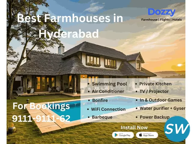Dozzy Farmhouse Rentals in Hyderabad offers you the perfect opportunity to book a beautiful farmhouse in Moinabad with zero down payment, making your dream getaway even more accessible. Known for offering the best farmhouses at affordable prices, Dozzy has you covered with stunning properties that cater to your every need. Whether it's a family vacation, a weekend escape, or a private celebration, our farmhouses provide the perfect setting with spacious interiors, lush green surroundings, and modern amenities. You can enjoy nature’s tranquility without worrying about high costs. With the added advantage of zero down payment, booking your next retreat has never been easier or more budget-friendly. Dozzy Farmhouse Rentals ensures you experience luxury and comfort at the best prices, making Moinabad your go-to destination for relaxation and leisure.