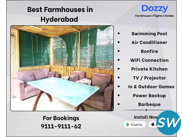 Looking for a beautiful farmhouse rental in Hyderabad? You need look no further than Dozzy Farmhouse: it's the right answer to all your needs for an affordable and luxurious getaway. Situated in a very quiet place, it is the ideal venue for family get-togethers, birthdays, office parties, and even a plain weekend getaway. Spacious and cozy accommodation, lush green lawns, and a serene atmosphere all come together to create the perfect ambience for relaxing and refreshing. Affordability does not run counter to quality, without giving up anything at Dozzy Farmhouse, by providing the swimming pool and indoor and outdoor games, a fully equipped kitchen with ample parking space.