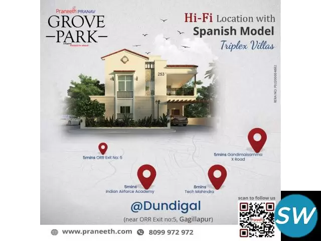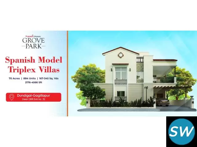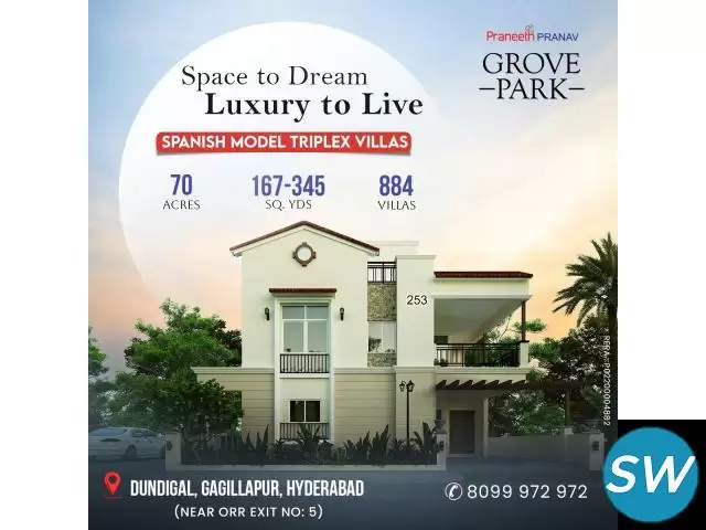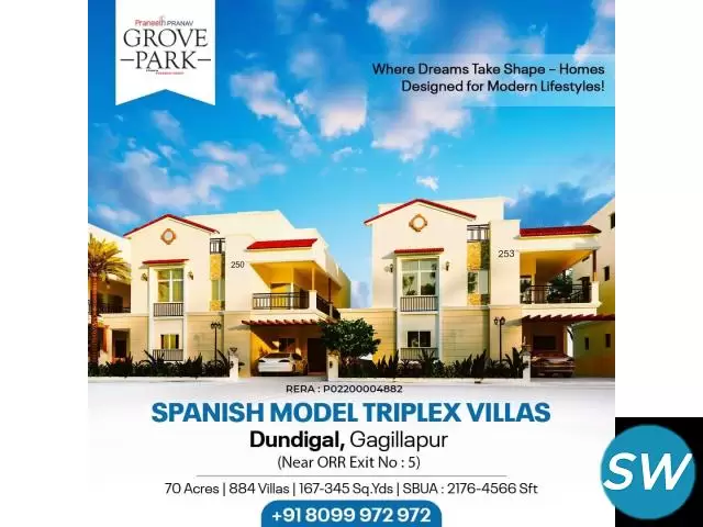 Triplex Villas for Sale in Gagillapur with inside lake view. Unlock the door to your future with our 4, 5BHK villas for sale in Gagillapur. Embrace the perfect blend of convenience and luxury in this sought-after location. Spread over a vast expanse of 70 acres, Grove Park stands as an elite villa community boasting 884 triplex villas. Nestled just 3 km from ORR Exit 5 in Gagillapur, this grand haven is an oasis of tranquillity amidst the urban hustle. Spread over a vast expanse of 70 acres, Grove Park stands as an elite villa community boasting 884 triplex villas.