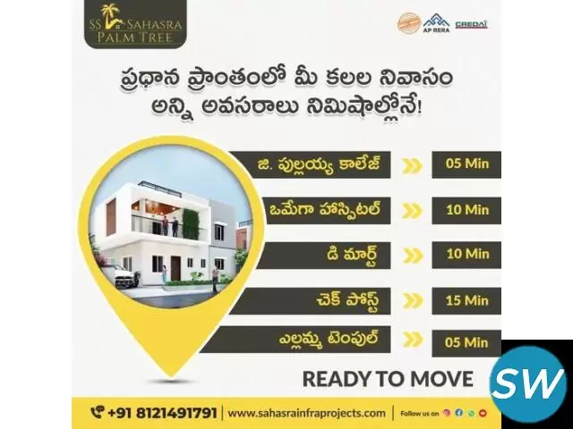 Find your dream home today with Kadru Homes, the leading real estate developers in Kurnool. Offering a wide range of residential villas designed with modern comforts and high-quality construction, Kadru Homes ensures you get the perfect home for your family. Make the right investment and secure your future with Kadru H...