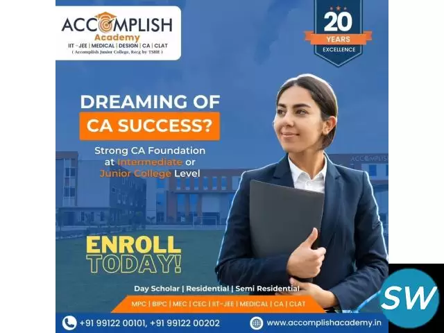 Looking for the best inter college for IIT JEE, NEET, CLAT, or CA in Shamshabad, Hyderabad? Look no further than Accomplish Academy. Renowned for its excellence in coaching, Accomplish Academy offers tailored programs to help students excel in these competitive exams. Our expert faculty, comprehensive curriculum, and cutting-edge resources ensure that students are well-prepared and confident. At Accomplish Academy, we focus on personalized attention and innovative teaching methods to maximize your potential. Whether aiming for IIT JEE, NEET, CLAT, or CA, our dedicated team is committed to your success. Choose Accomplish Academy in Shamshabad, Hyderabad, and set the foundation for a successful future. Contact us today to learn more about our programs and take the first step towards achieving your academic goals.