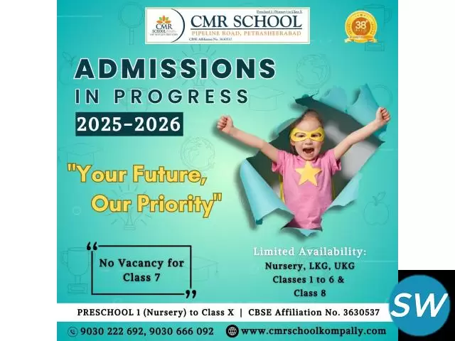 Looking for the Best Schools in Kompally? CMR School Kompally stands out as one of the Best CBSE Schools in Kompally, offering world-class education with a perfect balance of academics, extracurricular activities, and life skills. With experienced faculty, modern infrastructure, and a student-centric approach, CMR School nurtures young minds to excel in academics and beyond. Parents seeking a trusted institution for their child’s growth and success will find CMR School Kompally an ideal choice.