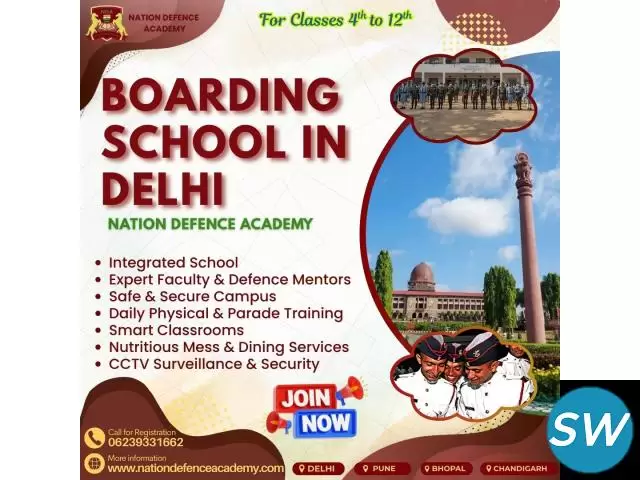 Nation Defence Academy offers one of the best boarding school options in Delhi for students aiming for all-round academic and personality development. Our campus provides disciplined residential facilities, experienced faculty, and a supportive learning atmosphere that helps every student thrive. From academics to physical training, we focus on nurturing leadership qualities and moral values. Both online and offline learning programs are available to match your educational goals. Join Nation Defence Academy and experience a perfect combination of education, discipline, and guidance in a secure environment.