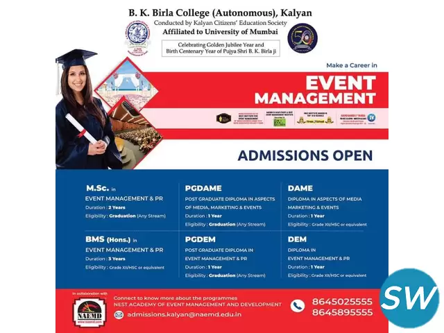 Kickstart your exciting journey into the events industry and get ready for better career opportunities by pursuing Degree & Diploma Programmes in Event Management and PR, offered by B K Birla College of Arts, Science & Commerce - Autonomous, Kalyan. in collaboration with NAEMD.