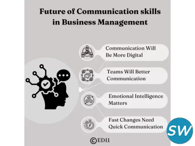 The future of communication skills in business management emphasizes adaptability, empathy, and tech-savvy interactions. Leaders must master clear, concise messaging, active listening, and cross-cultural competence to foster collaboration and innovation. Digital tools like AI and virtual platforms enhance efficiency but require emotional intelligence to maintain trust and engagement in hybrid work environments.