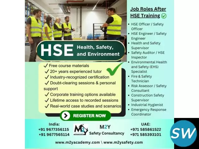 Comprehensive Workplace HSE Training by M2Y Safety equips employees with the essential skills and knowledge to identify hazards, manage risks, and comply with health, safety, and environmental regulations. Offered by M2Y Safety, this training focuses on preventing accidents, ensuring employee well-being, and maintaining a safe, sustainable work environment.