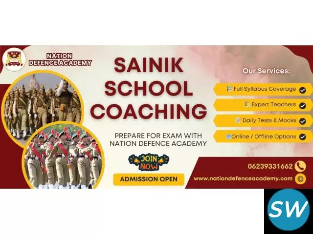 Nation Defence Academy provides top-quality Online Coaching for Sainik School Exam with expert mentors and a structured learning approach. Students get live interactive classes, detailed study material, mock tests, and performance analysis to strengthen every subject. Our experienced faculty ensures concept clarity and...