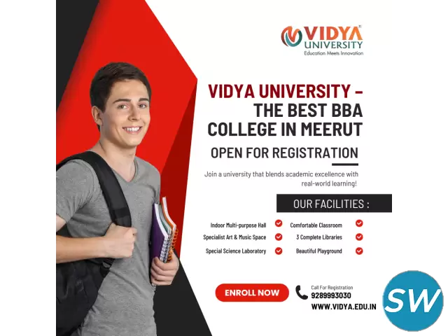 If you are planning to pursue BBA in Meerut, Vidya University stands out as the best BBA College in Meerut. Known for its modern curriculum, experienced faculty, and industry-oriented training, it is counted among the top BBA colleges in Meerut. With excellent infrastructure and placement opportunities, Vidya University has earned a reputation as one of the best colleges for BBA in Meerut, preparing students for successful careers in management and business.