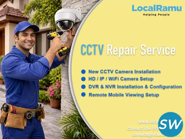 Accurate camera positioning and accurate DVR/NVR setup are important for effective surveillance. In Pune’s homes and businesses, professional installation prevents signal loss and network issues. LocalRamu offers expert CCTV installation and repair with skilled technicians to ensure clear video quality and long term functionality.