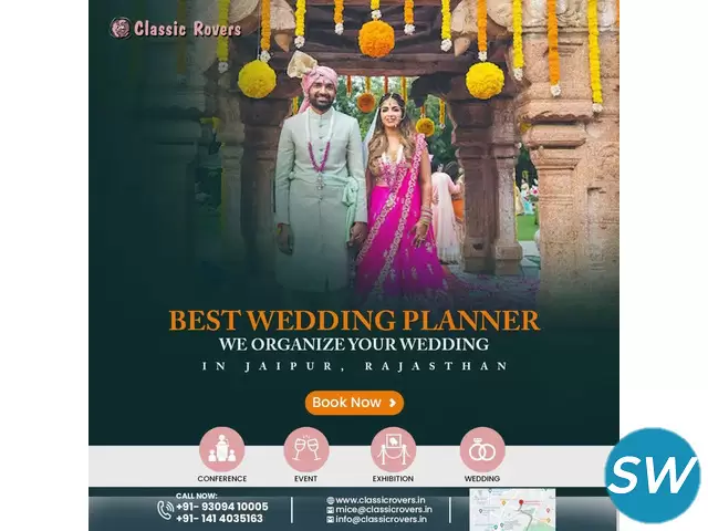 Classic Rovers brings your wedding dreams to life, offering a seamless experience as one of the leading wedding planners in Jaipur. Whether you envision a grand celebration or a charming, intimate gathering, our expert team crafts unforgettable memories. As trusted wedding organizers in Jaipur, we specialize in both luxury and budget-friendly weddings, ensuring that every detail aligns with your vision.