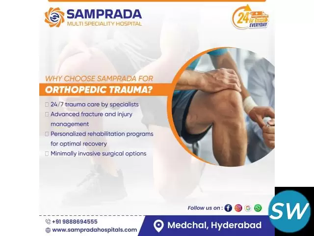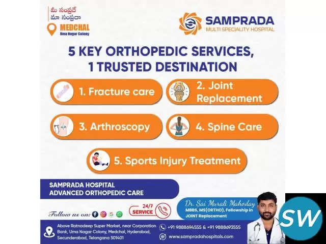 Samprada Hospitals offers expert orthopedic care with advanced treatments for fractures, joint pain, arthritis, spine disorders, and sports injuries. Our team of highly skilled orthopedic specialists provides personalized care, including minimally invasive surgeries, joint replacements, physiotherapy, and rehabilitation services. Equipped with state-of-the-art diagnostic and surgical technology, we ensure precise diagnosis and effective treatment to help you regain mobility and live pain-free. Trust Samprada Hospitals for comprehensive orthopedic care in Medchal. Book your appointment today for expert consultation and treatment!