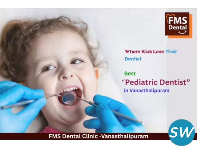"Best pediatric dentist in Vanasthalipuram" is available at FMS Dental Vanasthalipuram, Specialized care for children, including preventive & corrective treatments like fluoride varnish to prevent tooth decay and pit & fissure sealants, interceptive orthodontics, myofunctional appliances, habit breaking appliances, Invisalign First for young patients.