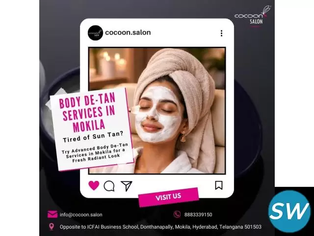 Indulge in premium Body De-Tan Services in Mokila at Cocoon Salon. Our expert therapists deliver gentle yet effective treatments designed to remove tan, hydrate skin, and enhance your natural glow. Enjoy a soothing, spa-like experience with visible results. At Cocoon Salon, we combine luxury, care, and expertise to giv...