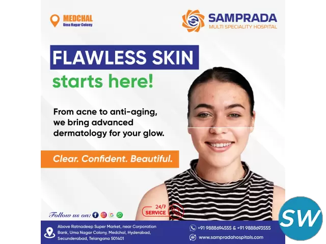 At Samprada Hospitals, we offer comprehensive dermatology services to address all your skin, hair, and nail concerns. As a leading multi-speciality hospital in Medchal, we provide advanced dermatological care with expert skin specialists who diagnose and treat a wide range of skin conditions.