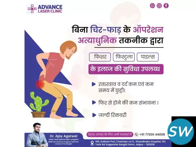 Dr. Ajay Agarwal specializes in the diagnosis and treatment of piles (hemorrhoids), offering both non-surgical and surgical solutions tailored to each patient’s needs. Using the latest techniques such as laser surgery and minimally invasive procedures, he ensures faster recovery, minimal pain, and reduced recurrence rates. Patients across Jaipur commend him for his accurate diagnosis and effective, patient-friendly approach.