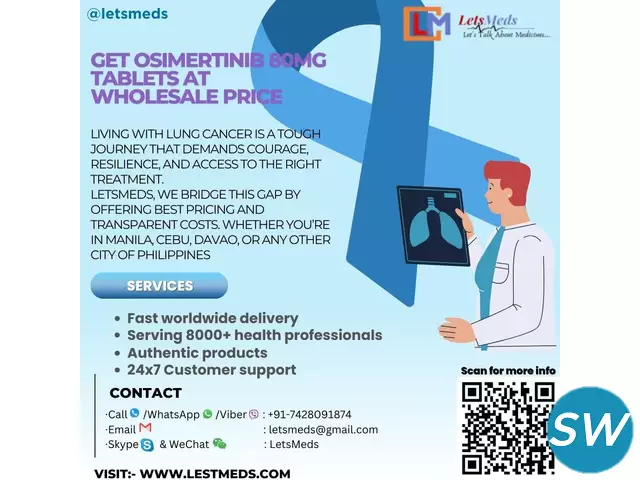 LetsMeds, we believe no one should have to choose between their health and convenience. Living with lung cancer is a tough journey that demands courage, resilience, and access to the right treatment. For many patients in the World, finding trusted and affordable medications like Osimertinib 80mg tablets through Letsmeds Pharmacy.That’s why we’ve made it our mission to deliver life-saving medications like Osimertinib directly to your doorstep anywhere in the Philippines.