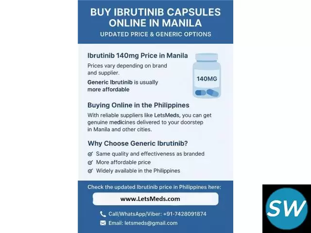 Due to the extremely high cost of branded ibrutinib in Philippines, many patients now choose affordable generic alternatives. Generic Ibrutinib offers the same active ingredient while keeping treatment costs manageable. With LetsMeds you get:
