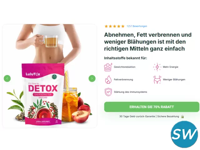 Lulutox Detox-Tee hebt sich im überfüllten Markt für Detox-Tees hervor. Als ein ganz natürlicher fettverbrennender Tee-Mix für Frauen angepriesen, soll er die natürlichen Entgiftungsprozesse des Körpers unterstützen, die Verdauungsregularität fördern und helfen, unangenehme Blähungen zu reduzieren.