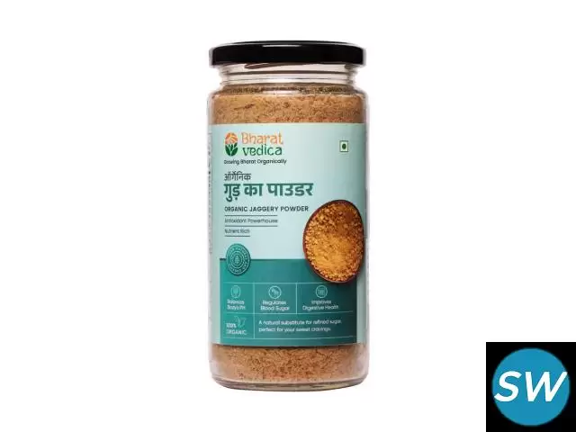 "Enjoy the natural sweetness of Jaggery powder - Organic Jaggery from Bharat Vedica, made from pure and fresh sugarcane. It is 100% organic, chemical-free, and full of natural minerals like iron and calcium that help keep you healthy.