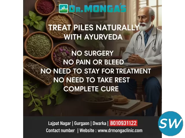 Need a reliable piles Ayurvedic clinic near me? Dr. Monga Medi Clinic provides specialised Ayurvedic treatment for piles, fissures, and fistula with proven therapies that give permanent relief. Their expert gastro-Ayurvedic doctors assess your condition and create a personalised plan involving herbal formulations, anti-inflammatory medicines, Kshar Karma, and lifestyle guidance. This ensures shrinking of hemorrhoids, smooth bowel movements, and complete healing without surgery.