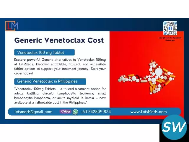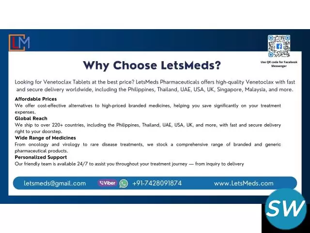 Get trusted and affordable Venetoclax 100mg Tablets from LetsMeds Pharmaceuticals, your reliable partner in global healthcare. We offer high-quality Indian alternatives with secure delivery to over 220 countries, including the Philippines, UAE, Thailand, and the USA. With a focus on accessibility and customer care, LetsMeds ensures a smooth ordering experience, fast shipping, and responsive support. Start your journey with confidence—contact us today on WhatsApp/Viber for pricing and assistance.