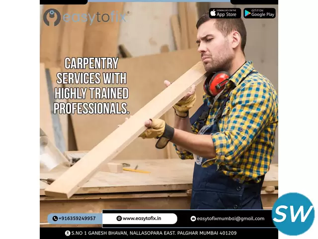 EasytoFix is one of the trusted providers of professional Carpentry services in Mumbai. We deliver high-quality woodworking solutions for homes, offices, and commercial spaces Whether you need furniture repairs, custom-made woodwork, or installation services.