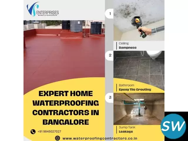VS Waterproofing provides expert home waterproofing contractors in Bangalore, specializing in bathroom seepage, terrace leakage, wall dampness, and roof leaks. Our team of skilled contractors is dedicated to delivering reliable solutions that protect your home from water damage. Whether dealing with persistent dampness in your walls or trying to prevent water seepage through your terrace and roof, we utilize advanced techniques and durable materials to ensure long-lasting results. Contact Waterproofing for professional and efficient solutions tailored to your specific needs, keeping your home dry, safe, and shielded from moisture-related problems.