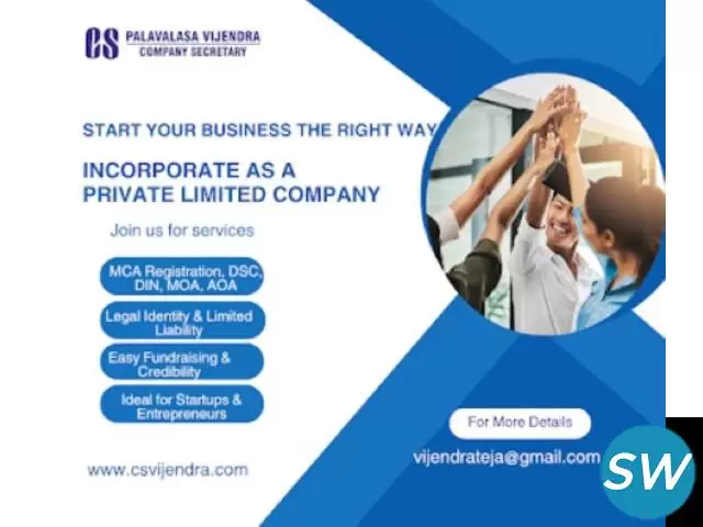 CS Vijendra & Co, we specialize in providing reliable and professional company incorporation services in Hyderabad to help entrepreneurs and businesses establish their legal identity seamlessly. Our skilled group of company secretaries makes sure that the Companies Act's statutory criteria are met during the business registration procedure. From choosing the right business structure to obtaining the Certificate of Incorporation, we handle every step with precision and efficiency. CS Vijendra & Co. specializes in comprehensive business registration services, including GST, trademark, and compliance solutions. With a dedicated team of experts, they simplify complex processes, ensuring speed and reliability. Their tailored approach empowers clients to focus on growth while they manage essential business functions effectively.