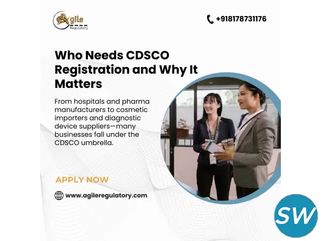 Looking for expert assistance with CDSCO Registration? Agile Regulatory offers professional consulting services for obtaining licenses and approvals from the Central Drugs Standard Control Organization (CDSCO) in India. Whether it's medical devices, cosmetics, or pharma products, our team ensures smooth documentation, application filing, and follow-ups. Get CDSCO approval with ease and stay compliant. Contact us today for a consultation!