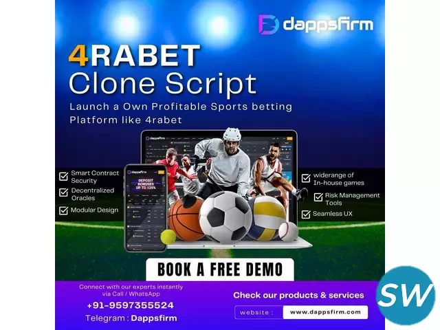 The 4rabet clone script is a pre-built software solution designed to replicate the functionalities of the popular online betting platform, 4rabet. This script enables entrepreneurs to launch their own betting sites quickly and efficiently, offering features like sports betting, casino games, and live betting options. Dappsfirm provides whitelabel 4rabet clone software at minimal cost, allowing businesses to customize their platform while reducing development time and expenses, making it an ideal choice for aspiring online betting operators.