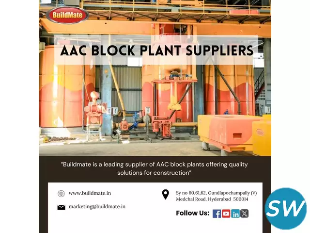 Buildmate is a trusted name among AAC Block Plant Suppliers in Hyderabad, providing advanced and reliable solutions for sustainable construction. With top-quality equipment and innovative technology, Buildmate ensures efficient production and long-lasting results. Their expertise meets diverse construction needs, making them the preferred choice for cutting-edge AAC block manufacturing solutions.