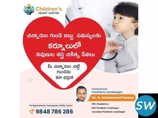 Providing both non-surgical and surgical cardiac treatments for children. Advanced pediatric heart care tailored to your child's needs.Trust the best hospital for pediatric heart surgery in Kurnool. Expert surgeons, cutting-edge treatments, and compassionate care for young hearts.Specialized care for congenital and pediatric cardiac diseases. Get expert diagnosis and treatment at Children's Heart Center in Kurnool.