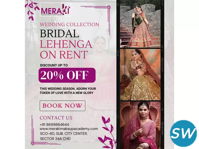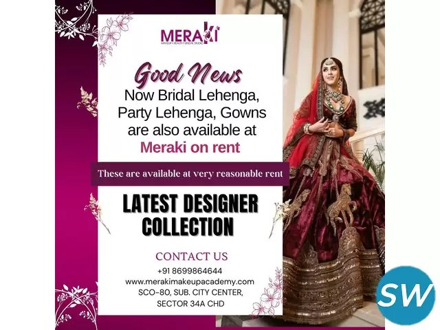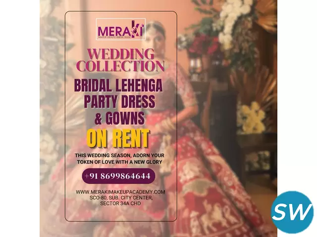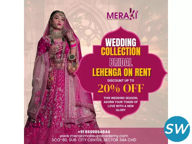 Discover exquisite bridal lehenga on rent in Chandigarh at Meraki Makeup Academy. Perfect for your special day, our collection features stunning designs that blend traditional elegance with modern trends. Each lehenga is meticulously crafted to ensure you look radiant without compromising your budget. With a variety of styles, colors, and sizes, Meraki Makeup Academy makes it easy to find your dream outfit for weddings, receptions, or pre-wedding ceremonies. Visit us to experience luxury and affordability, all under one roof. Make your wedding memorable with Meraki.