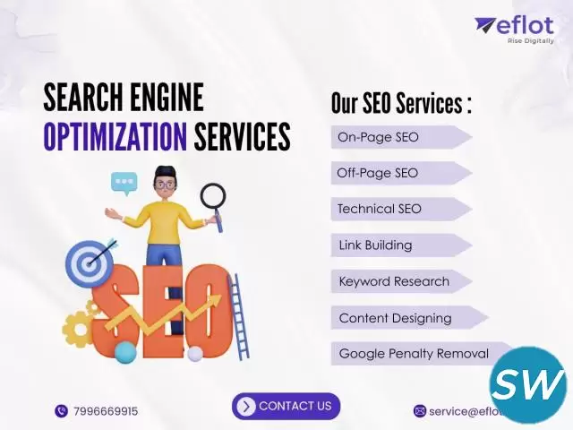 Looking to rank higher on Google and attract more customers? Eflot offers complete Search Engine Optimization (SEO) services including On-Page SEO, Off-Page SEO, Technical SEO, Link Building, Keyword Research, Content Designing, and Google Penalty Removal.