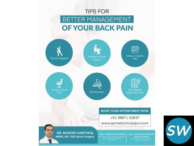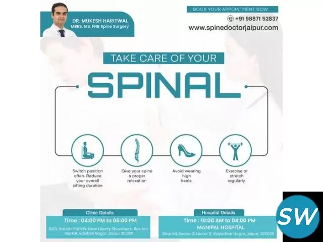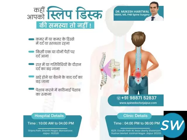 Struggling with back pain or slip disc issues? Dr. Mukesh Haritwal, a leading Slip Disc Doctor in Jaipur, offers advanced and personalised care to help you regain a pain-free life. With years of experience in spine care, Dr. Mukesh Haritwal specialises in slipped disc Treatment in Jaipur using modern techniques to reduce pain and improve mobility. Whether your slip disc pain is recent or chronic, Dr. Mukesh Haritwal provides detailed evaluations and treatment plans, including physiotherapy guidance, lifestyle advice, and surgical options when necessary. His patient-centered approach ensures that every patient receives the most suitable treatment for their condition, enabling them to return to daily activities with confidence. If you are looking for reliable Slip Disc Treatment in Jaipur, trust Dr. Mukesh Haritwal to guide you towards a healthier spine. Book your consultation today and take the first step towards a pain-free, active life with Dr. Mukesh Haritwal.