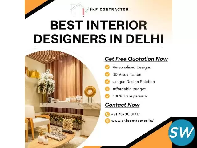 At SKF Contractor, we are recognized as one of the best interior designers in Delhi, offering customized solutions that redefine elegance and functionality. Our designs reflect a perfect blend of creativity, innovation, and comfort, making every space unique and aesthetically pleasing. Whether you dream of a modern, traditional, or luxury interior, we bring your vision to life with expert craftsmanship.