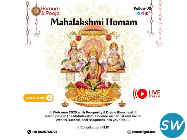 The Mahalakshmi Homam is a sacred Vedic ritual dedicated to Goddess Mahalakshmi, the deity of wealth, prosperity, and abundance. Performing this Homam is believed to invoke her blessings, bringing financial stability, success, and peace into your life. At Shastrigal.net, we specialize in organizing authentic Mahalakshmi Homam and other poojas to help you connect with divine energy and start your New Year on an auspicious note.