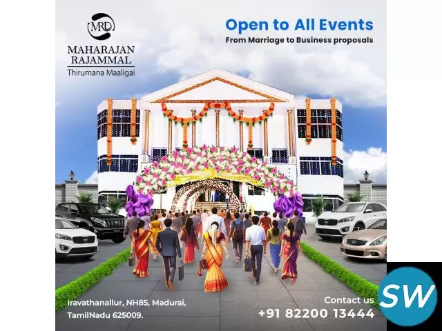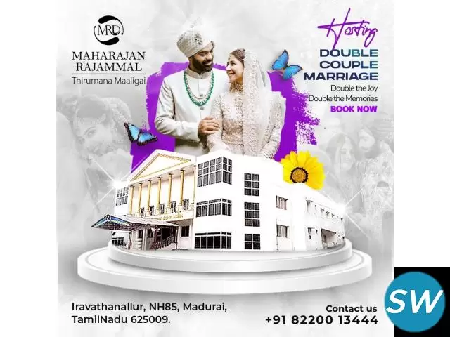 With spacious and well-decorated interiors, Maharajan Ambalam Rajammal Thirumana Maligai is designed to accommodate large gatherings, providing an ideal setting for a memorable marriage ceremony. The hall is equipped with modern amenities while retaining traditional charm, making it a sought-after destination for wedding functions and family events.