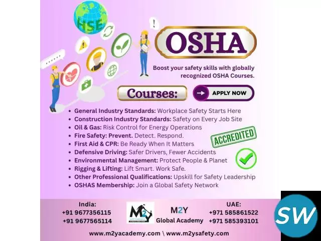 Comprehensive and globally recognized, OSHA Certification refers to safety training based on U.S. OSHA standards. M2Y Safety offers OSHA 10-hour and 30-hour courses for workers and supervisors. The training covers workplace hazards, safety procedures, and employee rights. It helps improve compliance and reduce workplace accidents. OSHA training from M2Y Safety is recognized across various industries globally.
