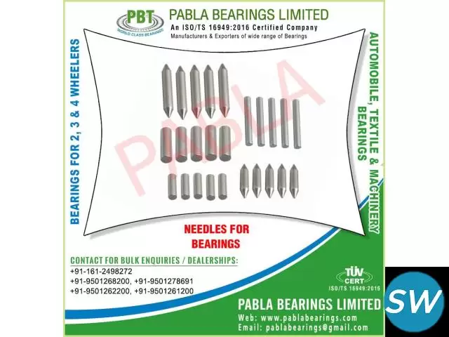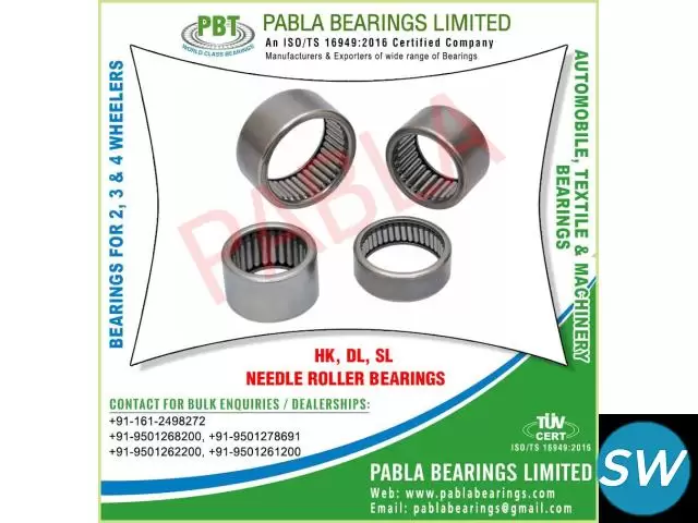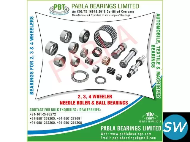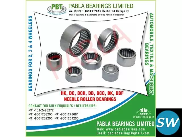 needle roller bearings, thrust bearing, welded cage bearings, hub pins, heavy duty ball bearings, needle bearings, roller bearings, 2 wheeler bearings, 3 wheeler bearings, 4 wheeler bearings, automobile needle roller ball bearings, ball bearings, auto parts bearings, needle roller bearings, turned cage needle roller bearings, nbi needle roller bearings, welded cage needle roller bearings, hub pins needle roller bearings, needles for needle roller bearings, thrust needle roller bearings, engine bearings, textile machinery bearings, general machinery bearings, hk dl sl needle roller bearings, hk dc dch db dcc bk dbf needle bearings, motorcycle engine bearings, scooter engine bearings, wheel bearings, stainless steel bearings, Ball Racer Kit , Handle Bearing, Suspension Kit manufacturers exporters suppliers traders sellers wholesale in India Punjab Ludhiana Mobile.