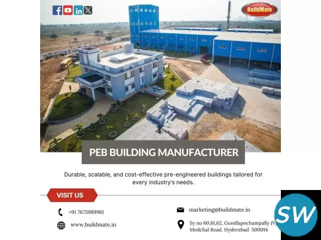 Buildmate stands as a leading manufacturer of pre-engineered buildings (PEBs), providing robust and economical solutions for a wide range of industries. Leveraging advanced technology, we create tailor-made structures that align with unique project needs. Committed to quality and efficiency, Buildmate is a trusted partner in modern infrastructure development.