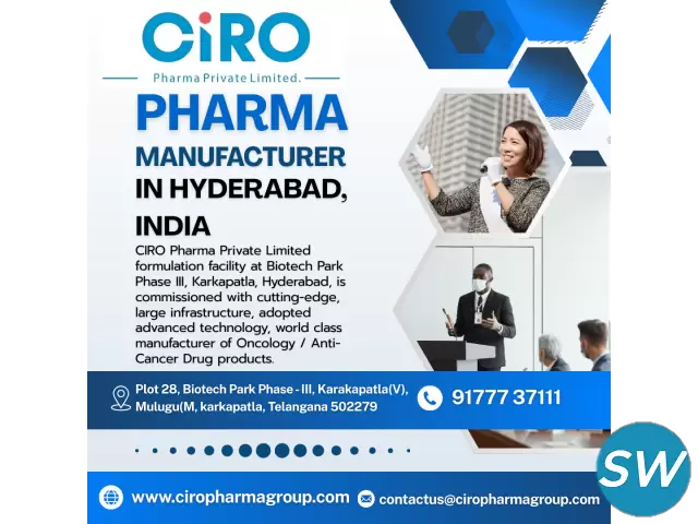 CIRO Pharma Private Limited is a rapidly growing Pharma Manufacturer in Hyderabad, India, recognized for its commitment to quality, innovation, and global healthcare standards. Located in one of India’s most prominent pharmaceutical hubs, CIRO Pharma has established itself as a trusted name in pharmaceutical and oncology drug manufacturing, serving both domestic and international markets.