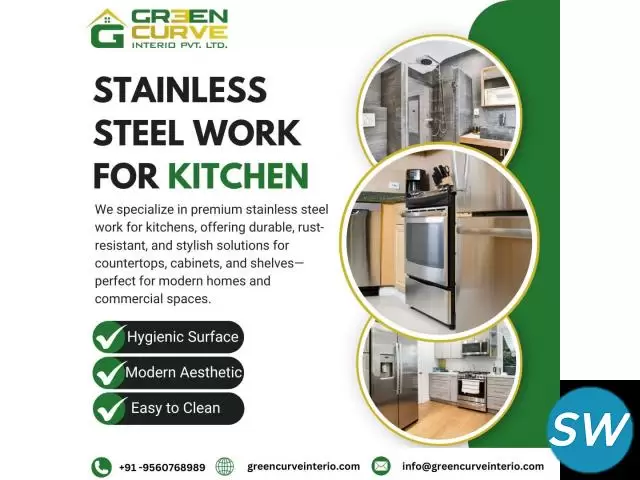 Upgrade your kitchen with stylish and durable stainless steel work for kitchen from Green Curve Interio. Our experienced team provides rust-free, low-maintenance, and long-lasting stainless steel work with modern designs. Be it countertops, cabinets, or a complete kitchen setup, we guarantee quality and perfection. Choose Green Curve Interio for your kitchen—the best in both style and budget.