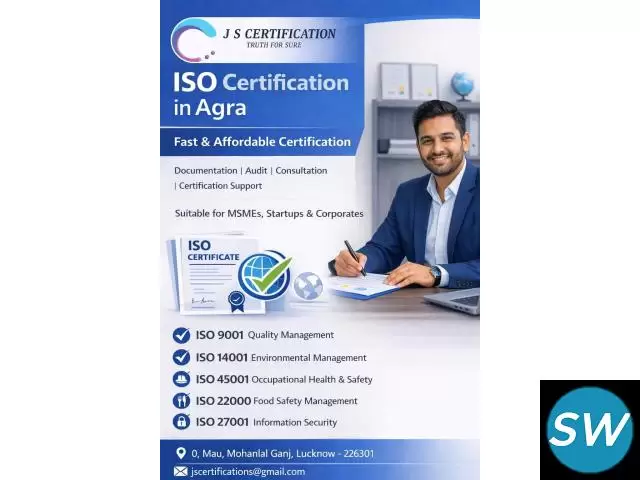 ISO Certification in Agra helps organizations adopt globally accepted management standards that enhance quality, efficiency, and customer trust. Professional ISO consultants provide assistance in documentation, system implementation, audit preparation, and certification processes for various ISO standards.