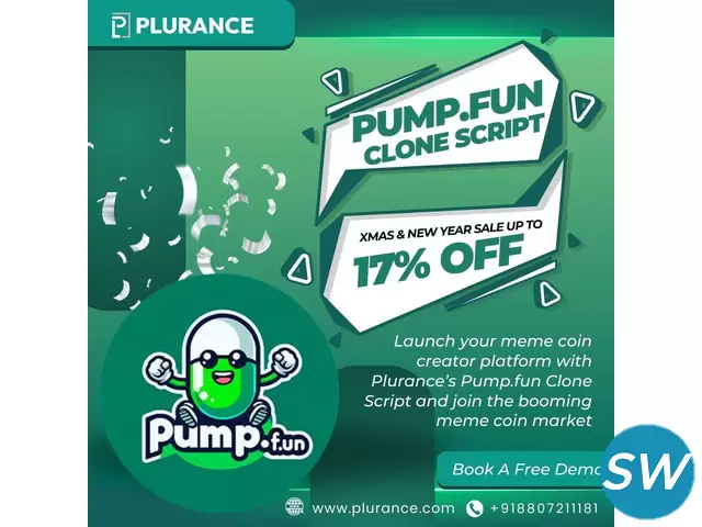 Launch your Meme Coin Creator Platform effortlessly with Plurance’s advanced Pump.fun Clone Script and seize the opportunity to dominate the meme coin market. This Christmas and New Year, enjoy up to 17% OFF on your platform setup. Empower creators, capitalize on trends, and start your meme coin journey today!