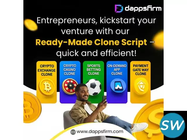 Dappsfirm offers a Ready-Made Clone Script to help entrepreneurs kick-start their platform idea swiftly. Launch your business like popular apps without coding from zero. Our White Label Ready-Made Clone Software ensures faster deployment with full branding control. Whether you're aiming for crypto exchange, casino games, sports betting, e-commerce, fintech, or delivery apps, we’ve got it covered. Use our Ready-Made App Clone and get your startup running with less time, cost, and development hassle. Contact us to get a free demo!