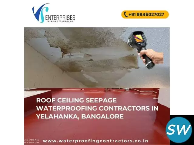 VS Waterproofing offers professional roof and ceiling seepage waterproofing contractors in Yelahanka, Bangalore, providing effective solutions for ceiling dampness and water leakage issues. Our team specializes in roof repair and waterproofing using advanced techniques and high-quality materials to ensure long-lasting protection from seepage. Whether it's a residential or commercial property, we identify the root cause of the problem and deliver specific waterproofing services to restore your roof and ceiling integrity. With a commitment to quality and customer satisfaction, we ensure a dry, safe, and damage-free living space. Contact us today for a site inspection and expert waterproofing solutions you can count on.